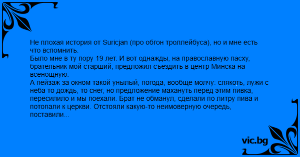 что вспомнить. Было мне в ту пору 19 лет. И вот однажды, на православную пасху, брательник мой старший, предложил съездить в центр Минска на всенощную. А пейзаж за окном такой унылый, погода, вообще молчу: слякоть, лужи с неба то дождь, то снег, но предложение махануть перед этим пивка, пересилило и мы поехали. Брат не обманул, сделали по литру пива и потопали к церкви. Отстояли какую-то неимоверную очередь, поставили свечки, каждый про что-то свое, послушали песнопения и примерно через пару часов решили двигать домой. Времени за 2:00 ночи. Церковь от нашего района в 20 километрах, пешком не вариант. Метро заработает только через три часа. А теперь попробую сориентировать Вас по деньгам. Средняя з/п в РБ тогда составляла 70 долларов (были и такие времена) 1 доллар весил 1900-2000 белорусских рублей, столько же стоила бутылка водки и половину этого бутылка пива. Коим мы после церкви с братом вновь и разжились. В эту промозглую ночь таксисты просто охуели, ну я понимаю центр, ну понимаю 20 километров, но заряжать ценник в 20 тысяч, это по тем временам нереальный борзежь. Мы даже прошлись 5 километров и что Вы думаете? Ценник не изменился! Слегка продрогшие, злые (пиво еще не открывали) вышли к главному проспекту. Ловим частников. Без шансов, город спит и тут чудо – к нам пикирует троллейбус (только в эту ночь я, валенок эдакий, узнал, что по городу ездит дежурный общественный транспорт). За баранкой восседал улыбчивый дядька немного за сорокет: - Ребята, вам куда? Наш военный городок был в значительном удалении от проспекта, но водителя это не смутило, он лишь спросил: - На полбутылочки дадите? - А почему на пол? Мы и на целую дадим. Это был отапливаемый троллейбус. Сорок минут рая. Сорок минут счастья. Только мы с братом в салоне. Вкуснейшее пиво (хренового тогда просто не умели делать). Мужик ПЯТЬ раз перекидывал рога на разные ветки, пока не доставил нас в точку города, от которой до дома было 10 минут ходьбы. Нужно ли говорить, что за такой люкс брат одарил его «на два пузыря». Спасибо тебе водитель, век помнить буду!