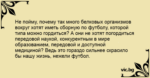 Не пойму, почему так много белковых организмов вокруг хотят иметь сборную по футболу, которой типа можно гордиться? А они не хотят погордиться передовой наукой, конкурентным в мире образованием, передовой и доступной медициной? Ведь это гораздо сильнее скрасило бы нашу жизнь, нежели футбол.