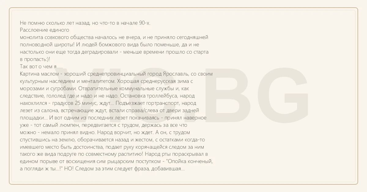 Не помню сколько лет назад, но что-то в начале 90-х. Расслоение единого монолита совкового общества началось не вчера, и не приняло сегодняшней полноводной широты! И людей бомжового вида было поменьше, да и не настолько они еще тогда деградировали - меньше времени прошло со старта в пропасть:)! Так вот о чем я..... Картина маслом - хороший среднепровинциальный город Ярославль, со своим культурным наследием и менталитетом. Хорошая среднерусская зима с морозами и сугробами. Отвратительные коммунальные службы и, как следствие, гололед где и надо и не надо. Остановка троллейбуса, народ нахохлился - градусов 25 минус, ждут... Подъезжает гортранспорт, народ лезет из салона, встречающие ждут, встали справа/слева от двери задней площадки... И вот одним из последних лезет покачиваясь - принял наверное уже - тот самый люмпен, передвигается с трудом, держась за все что можно - немало принял видно. Народ ворчит, но ждет. А он, с трудом спустившись на землю, оборачивается назад и жестом, с остатками когда-то имевшего место быть достоинства, подает руку корячащейся следом за ним такого же вида подруге по совместному распитию! Народ рты пораскрывал в едином порыве от восхищения сим рыцарским поступком - "Опойка конченый, а погляди ж ты...!" НО! Следом за этим следует фраза, добавившая необходимые штрихи в эту незаконченую картину: "Осторожней, любимая, гололед - НЕ ЕБ..НИСЬ!!!!!!!!" Вот оно бытие, определяющее сознание!!!! Вспоминаю с усмешкой, но почему-то с легкой грустью. Жизнь, бля...
