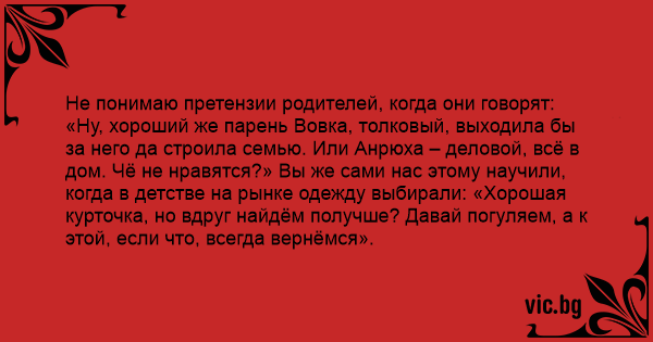 «Ну, хороший же парень Вовка, толковый, выходила бы за него да строила семью. Или Анрюха – деловой, всё в дом. Чё не нравятся?» Вы же сами нас этому научили, когда в детстве на рынке одежду выбирали: «Хорошая курточка, но вдруг найдём получше? Давай погуляем, а к этой, если что, всегда вернёмся».
