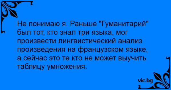Не понимаю я. Раньше "Гуманитарий" был тот, кто знал три языка, мог произвести лингвистический анализ произведения на французском языке, а cейчас это те кто не может выучить таблицу умножения.
