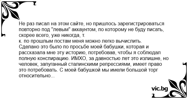 Сделано это было по просьбе моей бабушки, которая и рассказала мне эту историю, потребовав, чтобы я соблюдал полную конспирацию. ИМХО, за давностью лет это излишне, но человек, запуганный сталинскими репрессиями, имеет право это потребовать. С моей бабушкой мы имели большой торг относительно сроков разглашения - она требовала 100 лет, но я сторговался до 80, уповая на то, что могу и сам не дожить до нужной даты. Точноая дата мне неизвестна, забыл уточнить, а сейчас уже и спросить не у кого... Будем считать, что раз репрессии начались в 1937-м, то 80 лет уже прошло.