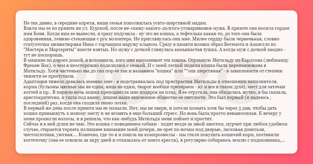 Не так давно, в середине апреля, наша семья пополнилась усато-шерстяной мадам. Взяли мы ее из приюта на ул. Курской, после не-скажу-какого-долгого-уговаривания-мужа. В приюте она носила гордое имя Боня. Когда нам ее вынесли, я сразу подумала - ну это не кошка, а тефтелька какая-то, до того она была здоровенная, лениво-стекающая с рук волонтера. Не приглянулась она мне. Милее сердцу была черненькая, словно статуэточка миниатюрная Ника с торчащим наружу клыком. Сразу в памяти возник образ Бегемота и Азазелло из "Мастера и Маргариты" вместе взятых. Но мужу с дочкой глянулась камышастая тушка. А когда муж с дочкой заодно - тут не поспоришь. В машине по дороге домой, я вспомнила, кого мне напоминает эта кошка. Огромную Матильду из Карлсона (любимицу Фрекен Бок), о чем я неосторожно поделилась с семьей. И с моей легкой подачи кошка была переименована в Матильду. Хотя частенько мы до сих пор ее так и называем "кошка" или "*опа шерстяная" - в зависимости от степени тяжести ее проступков. Адаптация тяжело давалась именно мне - я подстраивалась под пристрастия Матильды в отношении наполнителя, корма (бульоны мясные мы не едим, яица не едим, творог вообще презираем - ну и все в таком духе), мест для заточки когтей и пр.. В первую ночь кошка преподнесла мне подарок на плед. Я ее отругала, она обиделась жутко, я бы сказала, аристократично, и ушла под ванну, лишив наше никчемное общество ее светлости. Это был первый (и надеюсь , последний) раз, когда она сходила мимо лотка. В первый же день после приюта мы ее помыли. Нет, мы не звери, и хотели помыть хотя бы через 3 дня, чтобы дать кошке привыкнуть к новому месту и не вгонять в еще больший стресс. Но вонь была просто невыносимая. К вечеру у меня пропахли волосы, и я решила, что как-нибудь Матильда меня поймет и простит. Сейчас я в ней души не чаю. Это кошка с поведением собаки - ходит везде за мной хвостом, мурчит при любом удобном случае, старается терпеть излишнее внимание моей дочери, не орет по ночам под дверью, ласковая донельзя, чистоплотная, уютная.... Конечно, где-то я и пошла на компромиссы - мы стали покупать кошачий корм, поставили когтеточку (она ее освоила за пару дней и отказалась от моего кресла), я регулярно собираюсь землю с подоконника, потомучто , наверное, в прошлой жизни Матильда была кротом... Ну и аквариум - это отдельная песня. Это не только развлекуха, но и неистощимый запас питьевой воды! Просто пить из миски не прикольно! Из аквариума- самое то. Рыбки уже привыкли. Да, шерсти тоже многова-то в квартире, но это вопрос к хозяйке и ее лени, а не к кошке. Это я все к чему. Друзья, не бойтесь брать беспородных животных, они порой умнее породистых. Не бойтесь брать взрослых животных, иногда они более уместны, чем щенки и котята. И не бойтесь заводить животное в принципе - это бесконечный источник радости! П.С. Спасибо волонтерам, они не только спасли эту кошку с улицы и ухаживали за ней, не только простерилизовали ее , не только снабдили нас вет.паспортом со всеми прививками, но и давали кучу ценных советов! Это наидобрейшие люди, светлые души. Спасибо им за Матильду!