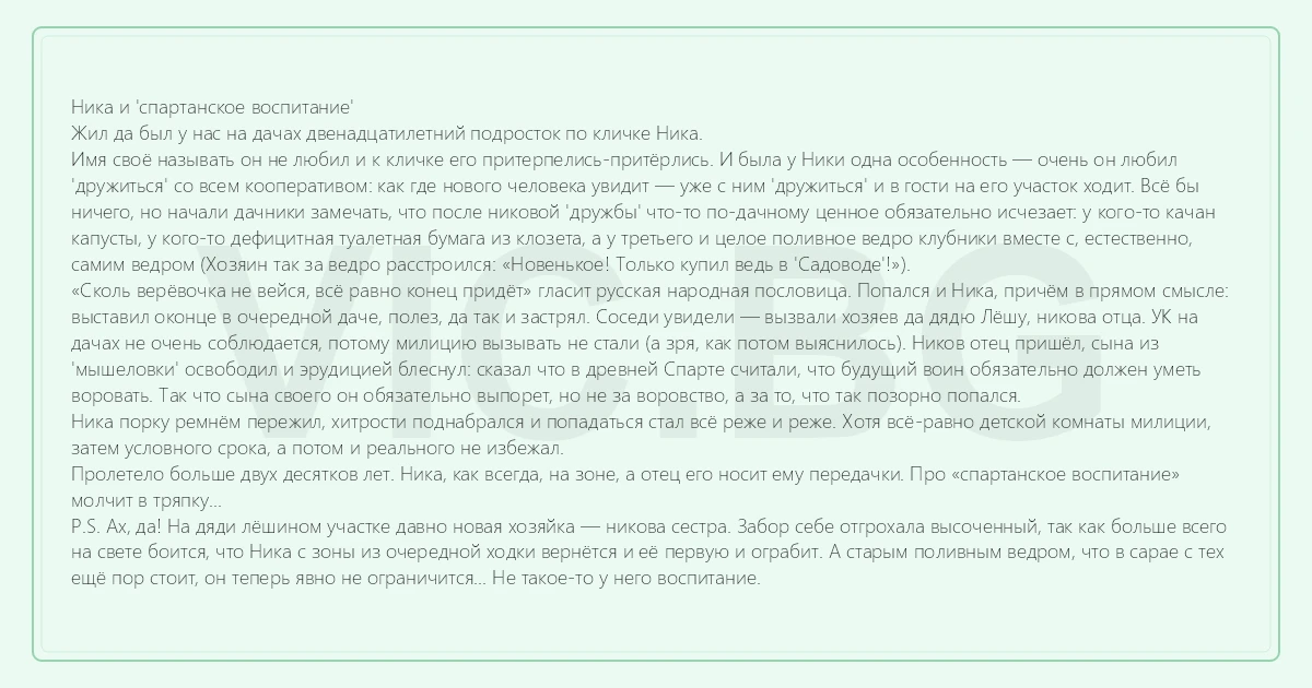 Ника и 'спартанское воспитание' Жил да был у нас на дачах двенадцатилетний подросток по кличке Ника. Имя своё называть он не любил и к кличке его притерпелись-притёрлись. И была у Ники одна особенность — очень он любил 'дружиться' со всем кооперативом: как где нового человека увидит — уже с ним 'дружиться' и в гости на его участок ходит. Всё бы ничего, но начали дачники замечать, что после никовой 'дружбы' что-то по-дачному ценное обязательно исчезает: у кого-то качан капусты, у кого-то дефицитная туалетная бумага из клозета, а у третьего и целое поливное ведро клубники вместе с, естественно, самим ведром (Хозяин так за ведро расстроился: «Новенькое! Только купил ведь в 'Садоводе'!»). «Сколь верёвочка не вейся, всё равно конец придёт» гласит русская народная пословица. Попался и Ника, причём в прямом смысле: выставил оконце в очередной даче, полез, да так и застрял. Соседи увидели — вызвали хозяев да дядю Лёшу, никова отца. УК на дачах не очень соблюдается, потому милицию вызывать не стали (а зря, как потом выяснилось). Ников отец пришёл, сына из 'мышеловки' освободил и эрудицией блеснул: сказал что в древней Спарте считали, что будущий воин обязательно должен уметь воровать. Так что сына своего он обязательно выпорет, но не за воровство, а за то, что так позорно попался. Ника порку ремнём пережил, хитрости поднабрался и попадаться стал всё реже и реже. Хотя всё-равно детской комнаты милиции, затем условного срока, а потом и реального не избежал. Пролетело больше двух десятков лет. Ника, как всегда, на зоне, а отец его носит ему передачки. Про «спартанское воспитание» молчит в тряпку... P.S. Ах, да! На дяди лёшином участке давно новая хозяйка — никова сестра. Забор себе отгрохала высоченный, так как больше всего на свете боится, что Ника с зоны из очередной ходки вернётся и её первую и ограбит. А старым поливным ведром, что в сарае с тех ещё пор стоит, он теперь явно не ограничится... Не такое-то у него воспитание.