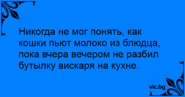 Никогда не мог понять, как кошки пьют молоко из блюдца, пока вчера вечером не разбил бутылку вискаря на кухне.