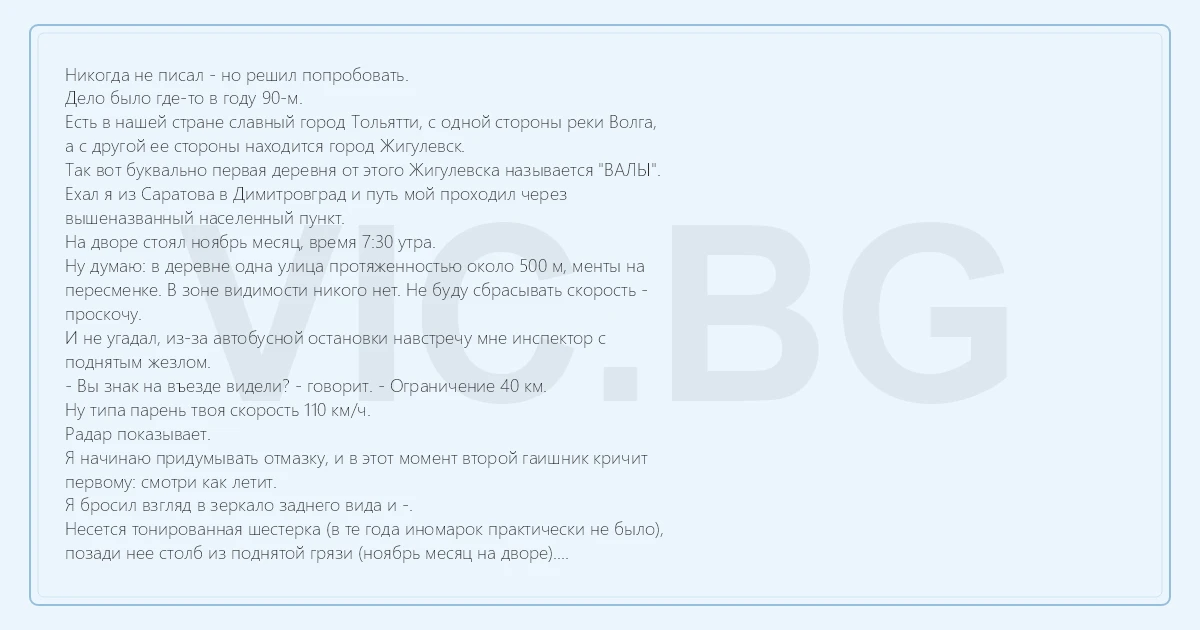 Никогда не писал - но решил попробовать. Дело было где-то в году 90-м. Есть в нашей стране славный город Тольятти, с одной стороны реки Волга, а с другой ее стороны находится город Жигулевск. Так вот буквально первая деревня от этого Жигулевска называется "ВАЛЫ". Ехал я из Саратова в Димитровград и путь мой проходил через вышеназванный населенный пункт. На дворе стоял ноябрь месяц, время 7:30 утра. Ну думаю: в деревне одна улица протяженностью около 500 м, менты на пересменке. В зоне видимости никого нет. Не буду сбрасывать скорость - проскочу. И не угадал, из-за автобусной остановки навстречу мне инспектор с поднятым жезлом. - Вы знак на въезде видели? - говорит. - Ограничение 40 км. Ну типа парень твоя скорость 110 км/ч. Радар показывает. Я начинаю придумывать отмазку, и в этот момент второй гаишник кричит первому: смотри как летит. Я бросил взгляд в зеркало заднего вида и -. Несется тонированная шестерка (в те года иномарок практически не было), позади нее столб из поднятой грязи (ноябрь месяц на дворе). Мент останавливает тачку, из нее выходит грузин-россиянин. И далее следует примерно вот такой диалог. Милиционер(М): - Вы на въезде в населенный пункт знак ограничение скорости 40 км видели? Грузин(Г): - Видэл да. М - А куда же вы так едете со скоростью 120 км в час? Г - А там еще один знак висит. М - (с удивлением) Какой? Г - ВАЛЫ. М - Ну и что? Г - Вот я и валу. Грузина отпустили.