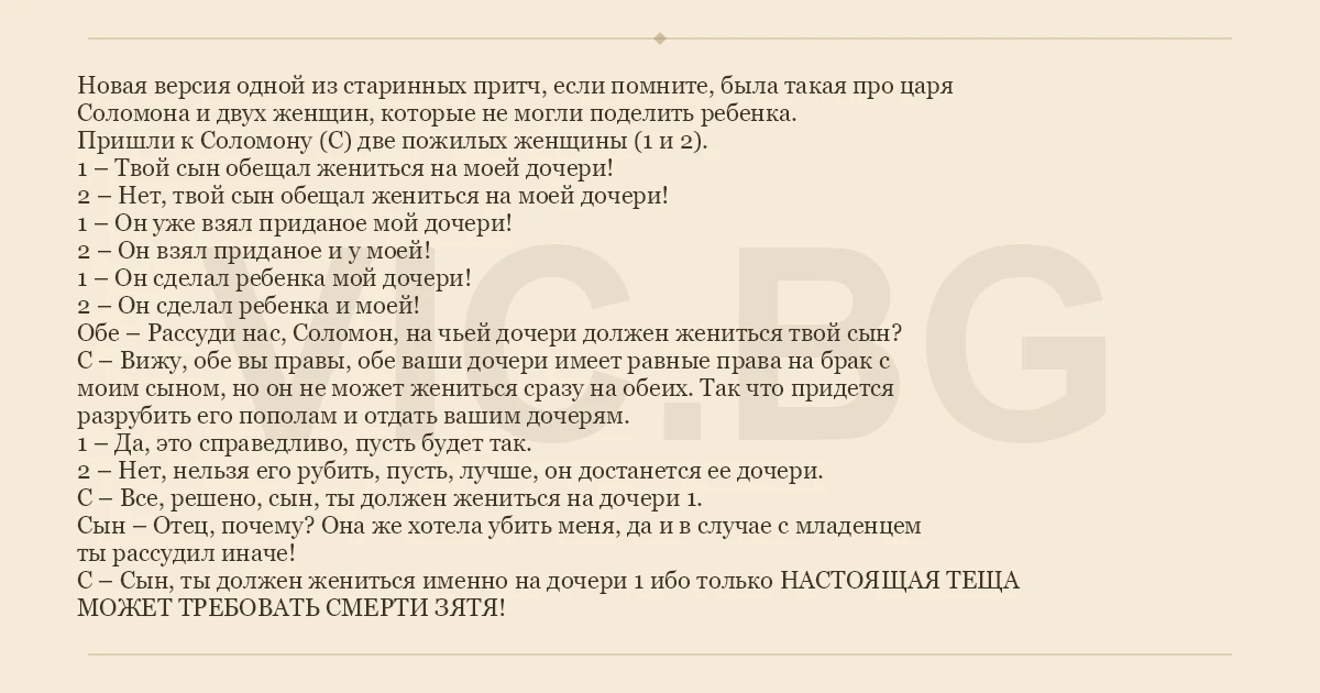 Новая версия одной из старинных притч, если помните, была такая про царя Соломона и двух женщин, которые не могли поделить ребенка. Пришли к Соломону (С) две пожилых женщины (1 и 2). 1 – Твой сын обещал жениться на моей дочери! 2 – Нет, твой сын обещал жениться на моей дочери! 1 – Он уже взял приданое мой дочери! 2 – Он взял приданое и у моей! 1 – Он сделал ребенка мой дочери! 2 – Он сделал ребенка и моей! Обе – Рассуди нас, Соломон, на чьей дочери должен жениться твой сын? С – Вижу, обе вы правы, обе ваши дочери имеет равные права на брак с моим сыном, но он не может жениться сразу на обеих. Так что придется разрубить его пополам и отдать вашим дочерям. 1 – Да, это справедливо, пусть будет так. 2 – Нет, нельзя его рубить, пусть, лучше, он достанется ее дочери. С – Все, решено, сын, ты должен жениться на дочери 1. Сын – Отец, почему? Она же хотела убить меня, да и в случае с младенцем ты рассудил иначе! С – Сын, ты должен жениться именно на дочери 1 ибо только НАСТОЯЩАЯ ТЕЩА МОЖЕТ ТРЕБОВАТЬ СМЕРТИ ЗЯТЯ!