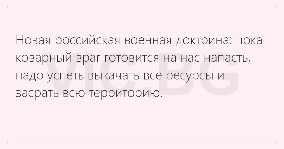 Новая российская военная доктрина: пока коварный враг готовится на нас напасть, надо успеть выкачать все ресурсы и засрать всю территорию.