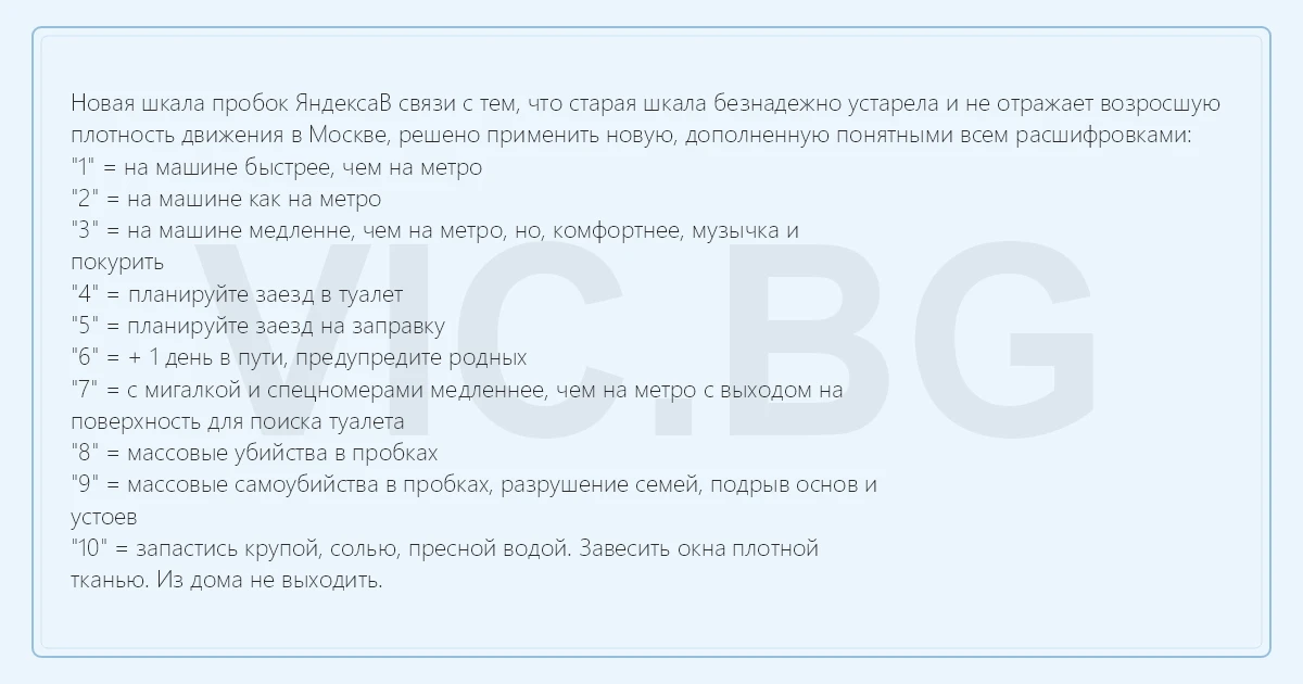 Новая шкала пробок ЯндексаВ связи с тем, что старая шкала безнадежно устарела и не отражает возросшую плотность движения в Москве, решено применить новую, дополненную понятными всем расшифровками: