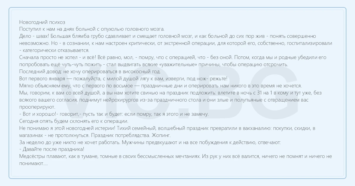 Новогодний психоз Поступил к нам на днях больной с опухолью головного мозга. Дело - швах! Большая блямба грубо сдавливает и смещает головной мозг, и как больной до сих пор жив - понять совершенно невозможно. Но - в сознании, к нам настроен критически, от экстренной операции, для которой его, собственно, госпитализировали - категорически отказывается. Сначала просто не хотел - и всё! Всё равно, мол, - помру, что с операцией, что - без оной. Потом, когда мы и родные убедили его попробовать ещё чуть-чуть пожить - стал выдвигать всякие «уважительные» причины, чтобы операцию отсрочить. Последний довод: не хочу оперироваться в високосный год. Вот первого января — пожалуйста, с милой душой лягу к вам, изверги, под нож- режьте! Мягко объясняем ему, что с первого по восьмое — праздничные дни и оперировать нам никого в это время не хочется. Мы, говорим, к вам со всей душой, а вы нам хотите свинью на праздник подложить: влетите в ночь с 31 на 1 в кому и тут уже, без всякого вашего согласия, поднимут нейрохирургов из-за праздничного стола и они злые и полупьяные с отвращением вас прооперируют. - Вот и хорошо!- говорит,- пусть так и будет: если помру, так я этого и не замечу. Сегодня опять будем склонять его к операции. Не понимаю я этой новогодней истерии! Тихий семейный, волшебный праздник превратили в вакханалию: покупки, скидки, в магазинах - не протолкнуться. Праздник потреблядства. Жопинг. За неделю до уже никто не хочет работать. Мужчины предвкушают и на все побуждения к действию, отвечают: - Давайте после праздника! Медсёстры плавают, как в тумане, томные в своих бессмысленных мечтаниях. Из рук у них всё валится, ничего не помнят и ничего не понимают. Обсуждают только «Где, когда, в каком составе, меню и напитки и не придётся ли докупать» Девушки медсёстры( слышал собственными ушами!) обсуждают, как можно остановить месячные на новогоднюю ночь. После праздников — совсем беда! Есть дежурные врачи в отделении. Мы, ординаторы, по очереди - каждый день делаем обходы. Я каждый день бываю в отделении... Но обязательно в эти, придуманные торгашами, новогодние каникулы, какое—нибудь ЧП да приключится! В кругу семьи я встречаю новый год - через раз. Однажды начал операцию (разрез!) с последним ударом кремлёвских курантов. В этом был элемент баловства, но не злостного: лишнюю минуту постоял со скальпелем наголо над бритой головой, как с бокалом шампанского, и с наступлением Нового Года — резанул. Не забывайте: для кого-то этот год - Новый, для кого-то — последний. Короче, всех - с наступающим Новым Годом. Счастья Вам и удачи. Hейрохирург Павел Рудич