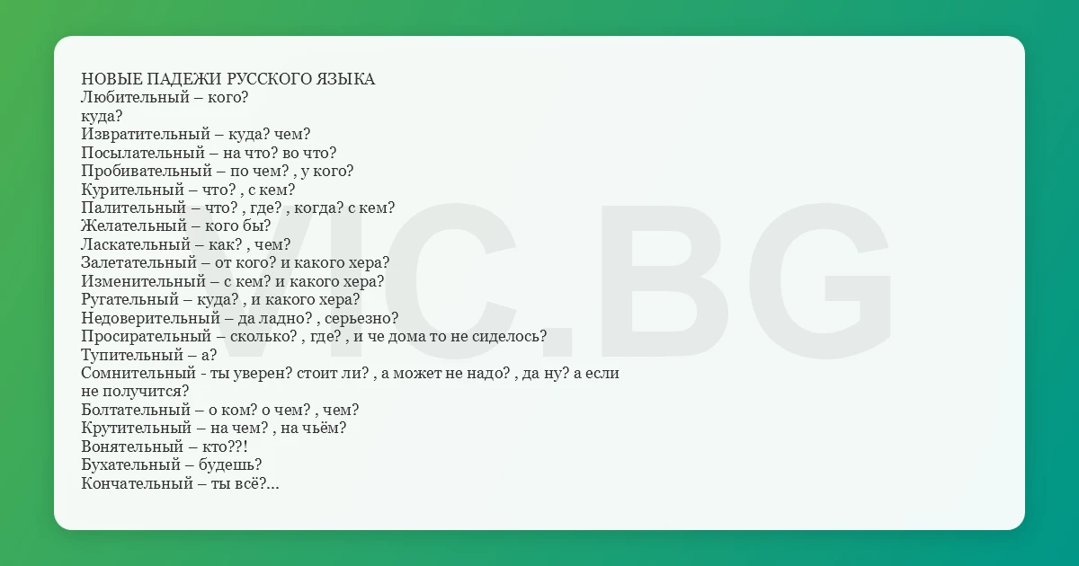НОВЫЕ ПАДЕЖИ РУССКОГО ЯЗЫКА Любительный – кого? куда? Извратительный – куда? чем? Посылательный – на что? во что? Пробивательный – по чем? , у кого? Курительный – что? , с кем? Палительный – что? , где? , когда? с кем? Желательный – кого бы? Ласкательный – как? , чем? Залетательный – от кого? и какого хера? Изменительный – с кем? и какого хера? Ругательный – куда? , и какого хера? Недоверительный – да ладно? , серьезно? Просирательный – сколько? , где? , и че дома то не сиделось? Тупительный – а? Сомнительный - ты уверен? стоит ли? , а может не надо? , да ну? а если не получится? Болтательный – о ком? о чем? , чем? Крутительный – на чем? , на чьём? Вонятельный – кто??! Бухательный – будешь? Кончательный – ты всё? Старательный – тебе понравилось? а сейчас? Горноспасательный – что держать? ты куда? Завлекательный – до дна? пойдем? Мечтательный – ты на мне женишься? ты куда??