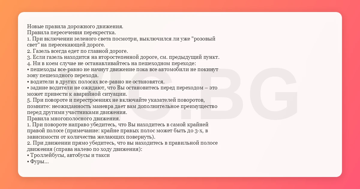 Новые правила дорожного движения. Правила пересечения перекрестка. 1. При включении зеленого света посмотри, выключился ли уже "розовый свет" на пересекающей дороге. 2. Газель всегда едет по главной дороге. 3. Если газель находится на второстепенной дороге, см. предыдущий пункт. 4. Ни в коем случае не останавливайтесь на пешеходном переходе: • пешеходы все-равно не начнут движение пока все автомобили не покинут зону пешеходного перехода. • водители в других полосах все-равно не остановятся. • задние водители не ожидают, что Вы остановитесь перед переходом – это может привести к аварийной ситуации. 5. При повороте и перестроениях не включайте указателей поворотов, помните: неожиданность маневра дает вам дополнительное преимущество перед другими участниками движения. Правила многополосного движения. 1. При повороте направо убедитесь, что Вы находитесь в самой крайней правой полосе (примечание: крайне правых полос может быть до 3-х, в зависимости от количества желающих повернуть). 2. При движении прямо убедитесь, что вы находитесь в правильной полосе движения (справа налево по ходу движения): • Троллейбусы, автобусы и такси • Фуры • Грузовики • Газели • Газели и легковые автомобили (примечание: если на дороге менее 5-ти полос в одном направлении, легковые автомобили заполняют промежутки между другими видами а/тр-та. Езда с использованием спецсигналов. 1. При выезде на встречную полосу с использованием спецсигналов, убедитесь, что Вы один такой. 2. Спецсигналы помогают не всегда (в пробке, например). В таких случаях их применение не дает желаемого эффекта, "чтобы они все провалились". Правила обгона фур. 1. Объезжая фуры по соседней полосе, вы находитесь в зоне риска, поскольку все водители фур являются тайными членами общества любителей дорожного слалома.