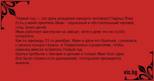 "Новый год — это день рождения каждого человека"(Чарльз Лэм)Есть у меня приятель Иван - серьезный и обстоятельный человек, отец троих детей.