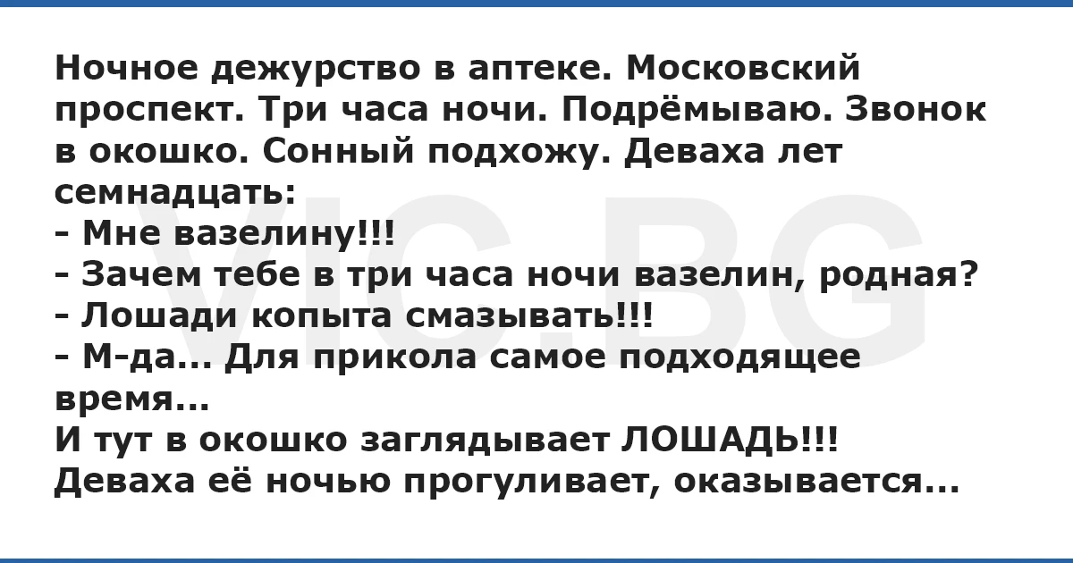 Ночное дежурство в аптеке. Московский проспект. Три часа ночи. Подрёмываю. Звонок в окошко. Сонный подхожу. Деваха лет семнадцать: - Мне вазелину!!! - Зачем тебе в три часа ночи вазелин, родная? - Лошади копыта смазывать!!! - М-да... Для прикола самое подходящее время... И тут в окошко заглядывает ЛОШАДЬ!!! Деваха её ночью прогуливает, оказывается...