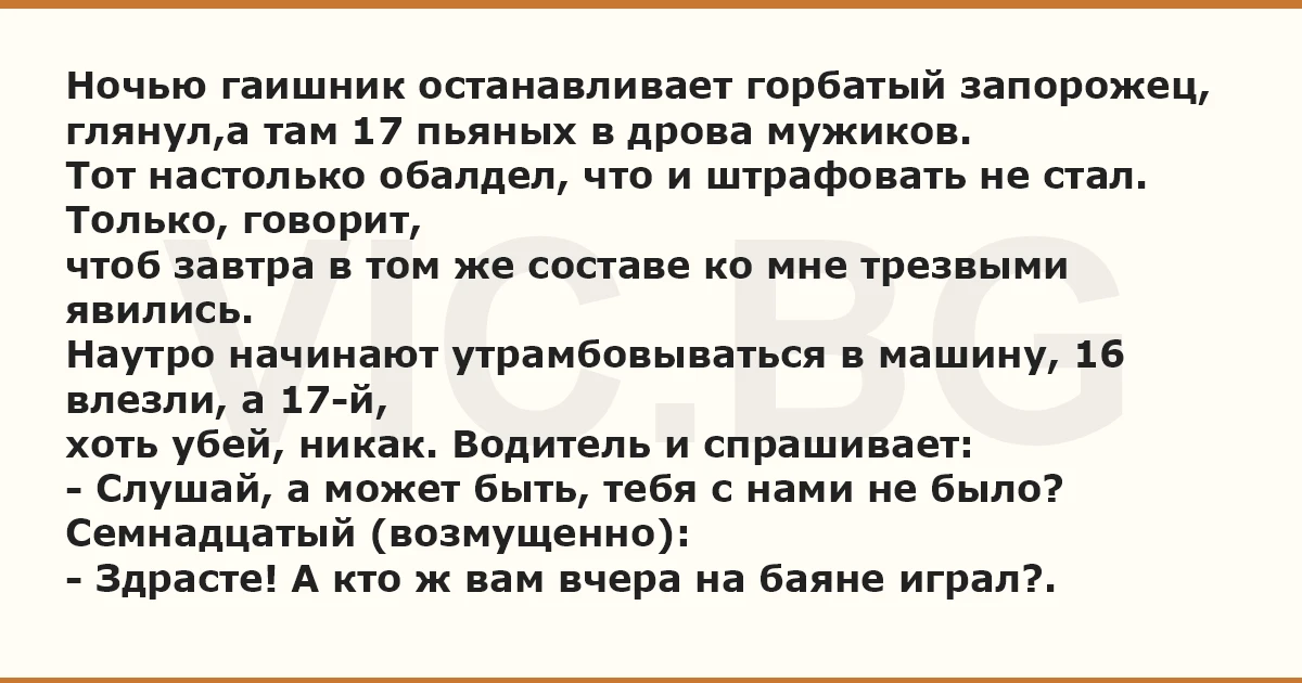 Ночью гаишник останавливает горбатый запорожец, глянул,а там 17 пьяных в дрова мужиков.