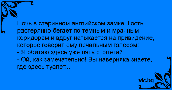 Ніч в старовинному англійському замку. Гість в розпачі бігає по темним коридорам та раптом зустрічає привида. — Я тут мешкаю вже 400 років, — каже привид. — О, як добре! — радіє гість. — Ви напевно...