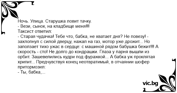 - Старая чудачка! Тебе что, бабка, не хватает дня? Не повезу! - захлопнул с силой дверцу, нажал на газ, мотор уже дрожит... Но заползает тихо ужас в сердце: с машиной рядом бабушка бежит!!! А скорость - сто! Не долго до кондрашки. Глаза у парня вышли из орбит. Зашевелились кудри под фуражкой... А бабка уж проклятая хрипит... Предчувствуя конец неотвратимый, в отчаянии шофер притормозил: