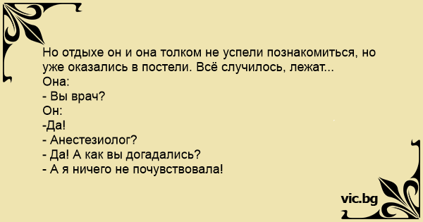 Анестезиолог The Doctor's Convention Von Beruf Anästhesist Двама били заедно, на сутринта дамата пита: Ο καταδρομέας.. Un homme et une femme se rencontrent dans un bar. Ils discutent un peu et puis comme cela arrive dans la vie, ils décident d'aller chez la femme. Срещат се двама в бара, хихо-хахо, айде на "кафе". A guy and a girl met at a bar. Утро. Южный приморский город. Курортный роман. Интеллигентная пара (за 40) проснувшись, принимает водные процедуры. Une femme et un homme font l'amour. Après l'acte sexuel, l'homme demande : A guy and a girl meet at a bar. They get along so well that they decide to go to the girl’s place. A few drinks later, the guy takes off his shirt and then washes his hands. He then takes off his pants and washes his hands. The girl watches him and says, “You must be a dentist” The guy,... C'est un séminaire médical. Au cours d'un des nombreux banquets prévus, un médecin homme repère un médecin femme. Ils font connaissance, et elle accepte un rendez-vous pour un dîner au restaurant en tête à tête. Au restaurant, avant de s'asseoir à la... De båda läkarna hade träffats på en kongress. Han var från Göteborg och hon var från Stockholm. De åt middag tillsammans och fortsatte i baren för att avsluta kvällen på hans hotellrum och i hans... W czasie stosunku siostra dyżurna mówi do lekarza dyżurnego: - Panie doktorze, pan to chyba jest anestezjolog! - Zgadza się, skąd pani to wie? - odparł lekarz. Na to siostra: - Bo nic nie czuję! Buen dentista Un chico y una chica se encuentran en un bar. Se llevan tan bien que deciden ir a un lugar más privado, al apartamento de ella. Un par de copas más tarde, el chico se quita la camisa... Two doctors are having s*x, he says to her, "You must be a surgeon, you washed your hands before and after." She replies, "Well you must be an anesthetist, because I didn't feel a f*cking thing!" De mødte hinanden på en bar og vågnede op i samme seng. Jeg ved hvad du laver sagde pigen, du er pædagog. Ja, men hvordan vidste du det? På dit lilla undertøj. Nå sagde han, så må du jo være... Due medici dopo un congresso scopano a letto. Alla fine lui dice: “Dall’abilita’ delle tue mani scommetto che sei ginecologa!”. Lei: “E tu anestesista!”. “Ma come fai a dirlo?”. Lei: “Non ho... Despues de hacer el amor ella le pregunta a el: - Papi tu eres anesteciologo?- El sorprendido dice: - Si,xq lo preguntas?- - Xq yo no senti un ****- Jajaja Efter sexualakten säger söta Sara: - Du Klas. Är du narkosläkare eller....? Klas: - Nej, hurså? Söta Sara: - Jag kände ju för fasen ingenting... Un couple a fait l'amour pour la première fois. Après tout ça, le mec demande à sa copine qui va se laver les mains : - Dis-moi, tu voudrais être infirmière plus tard ? - Non. Pourquoi ? - Parce... Nākamajā rītā pēc pirmās nakts. Viņa: ?Kāda īsti ir tava profesija?? Viņš: ?Anesteziologs.? Viņa: ?Tagad skaidrs, kāpēc es neko nejutu.? Σε ένα συνέδριο γιατρών ένας άντρας και μια γυναίκα κοιτάζονται επίμονα. Ο άντρας της προτείνει να πάνε για δείπνο και αυτή δέχεται. Στο εστιατόριο αυτή ζητάει συγγνώμη και πηγαίνει να πλύνει τα...