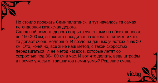 Сплошной ремонт, дорога вскрыта участками на обеих полосах по 150-300 км, а техника находится на каком-то пятачке и что-то делает очень медленно. И везде на данных участках знак 30 км. Это, конечно, все ж не наш метод, с такой скоростью передвигаться. И не метод казахов, которые летят со скоростью под 80-100 км в час. И вот что делать, ведь штрафы и прочие ужасы от гаишников неминуемы? Решение очень простое: пристроиться за казахом и ехать, не обгоняя. Когда ему все ж удается оторваться, не понимая почему за ним несется черный джип с российскими номерами, находим нового казаха и так до Алма-Аты. Когда казахи кончаются, строго соблюдаем скоростной режим в ожидании нового казаха.