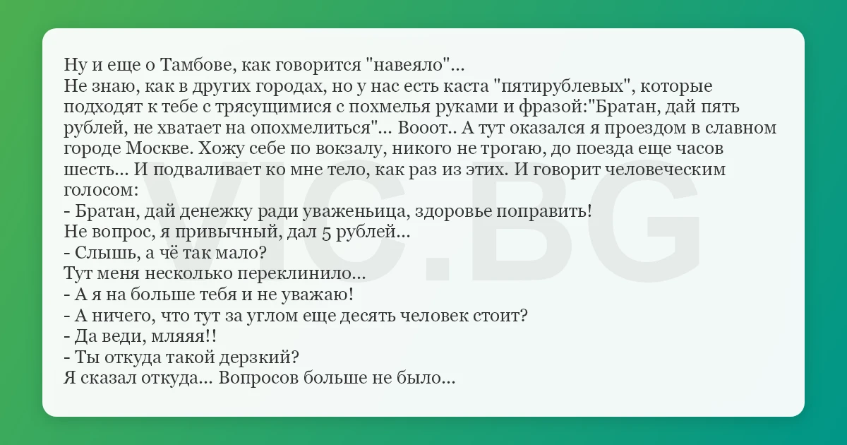 Ну и еще о Тамбове, как говорится "навеяло"... Не знаю, как в других городах, но у нас есть каста "пятирублевых", которые подходят к тебе с трясущимися с похмелья руками и фразой:"Братан, дай пять рублей, не хватает на опохмелиться"... Вооот.. А тут оказался я проездом в славном городе Москве. Хожу себе по вокзалу, никого не трогаю, до поезда еще часов шесть... И подваливает ко мне тело, как раз из этих. И говорит человеческим голосом: - Братан, дай денежку ради уваженьица, здоровье поправить! Не вопрос, я привычный, дал 5 рублей... - Слышь, а чё так мало? Тут меня несколько переклинило... - А я на больше тебя и не уважаю! - А ничего, что тут за углом еще десять человек стоит? - Да веди, мляяя!! - Ты откуда такой дерзкий? Я сказал откуда... Вопросов больше не было...