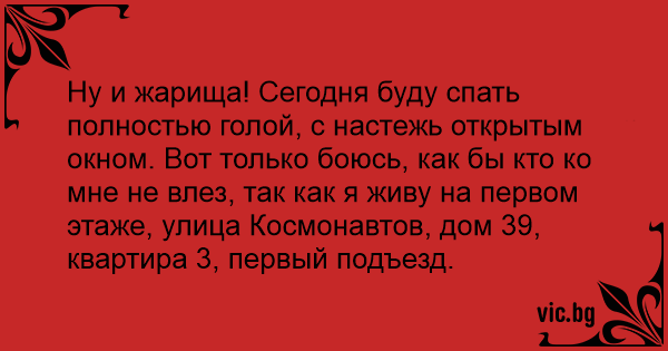 Ну и жарища! Сегодня буду спать полностью голой, с настежь открытым окном. Вот только боюсь, как бы кто ко мне не влез, так как я живу на первом этаже, улица Космонавтов, дом 39, квартира 3, первый подъезд.