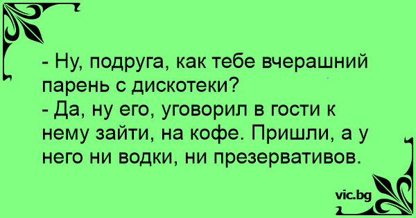 - Да, ну его, уговорил в гости к нему зайти, на кофе. Пришли, а у него ни водки, ни презервативов.
