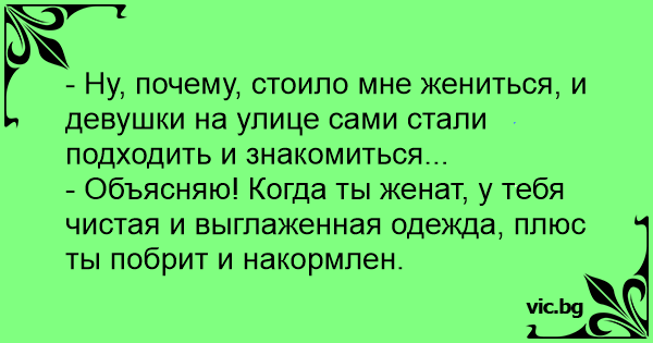 - Объясняю! Когда ты женат, у тебя чистая и выглаженная одежда, плюс ты побрит и накормлен.