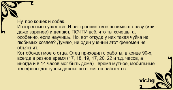 Прошло время. Кота уже давно нет;( Живу с женой "в частном доме". В доме есть и собаки, и кошки. Долго не мог понять, откуда жена знает, что я минут через 5-10 должен подъехать на машине домой (не важно сколько сейчас на часах - хоть 11 или 16, или 22). Рабочий день у меня не нормированный. Я не звоню и не предупреждаю, что приеду. Просто она знает, что сегодня я буду дома. Потом она рассказала, что животные как-то странно себя начинают вести, просто так, на пустом месте. Ломятся на улицу, скулят. В общем, поведение не совсем адекватное. Ладно бы, кто-то стучал в калитку или, допустим, я позвонил, а животные услышали мой голос и поняли, что я подъезжаю (согласен, бред), а тут просто на пустом месте. Ну, а минут через 10 или 15 ты приезжаешь. Вот, говорит, я и стала звонить тебе и напоминать что надо купить по дороге, куда заехать в нашей деревне, ну и т.д.