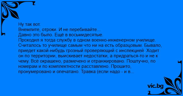 Проходил я тогда службу в одном военно-инженерном училище. Считалось то училище самым что ни на есть образцовым. Бывало, приедет какой-нибудь грозный проверяющий с инспекцией. Ходит он по территории, выискивает недостатки, а придраться-то и не к чему. Всё окрашено, размечено и отранжировано. Поштучно, по номерам и по комплектности расставлено. Прошито, пронумеровано и опечатано. Травка (если надо - и в декабре) зеленеет; краники в умывальных комнатах при казармах, что то солнышко, блестят – поэзия!