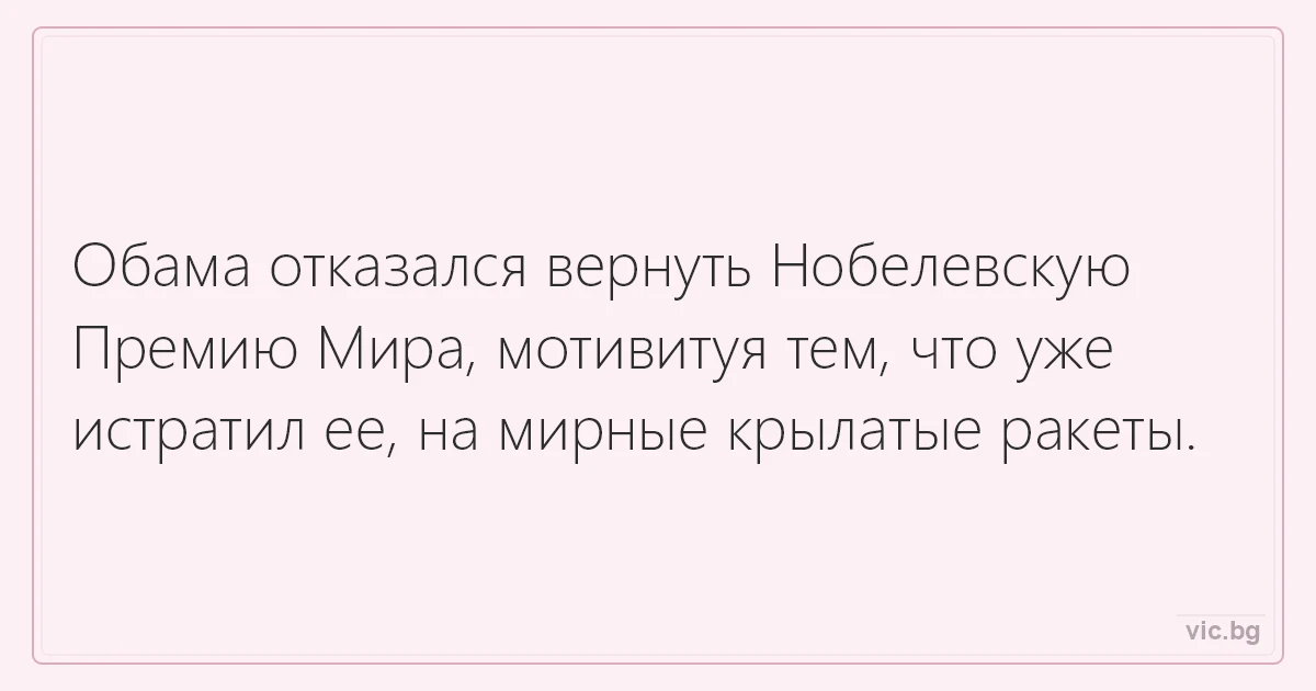 Български English Deutsch Español Обама отказался вернуть Нобелевскую Премию Мира, мотивитуя тем, что уже истратил ее, на мирные крылатые ракеты. Français Italiano Ελληνικά Македонски Türkçe Українська Português Polski Svenska Nederlands Dansk Norsk Suomi Magyar Româna Čeština Lietuvių Latviešu Hrvatski