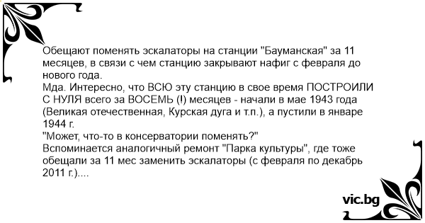 Обещают поменять эскалаторы на станции "Бауманская" за 11 месяцев, в связи с чем станцию закрывают нафиг с февраля до нового года.