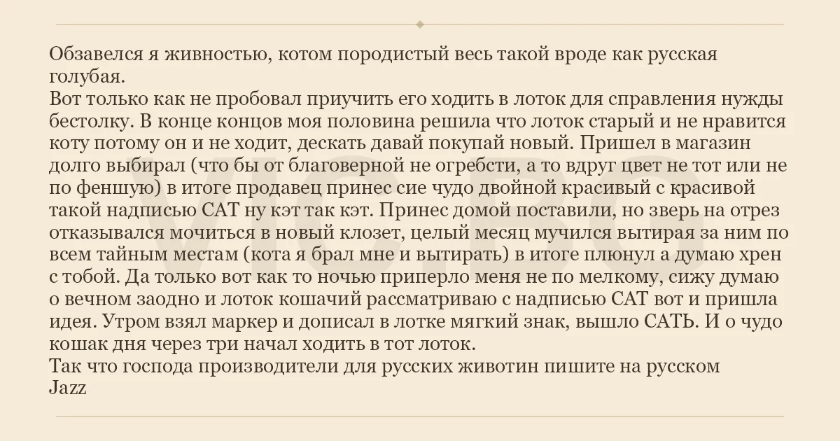 Обзавелся я живностью, котом породистый весь такой вроде как русская голубая. Вот только как не пробовал приучить его ходить в лоток для справления нужды бестолку. В конце концов моя половина решила что лоток старый и не нравится коту потому он и не ходит, дескать давай покупай новый. Пришел в магазин долго выбирал (что бы от благоверной не огребсти, а то вдруг цвет не тот или не по феншую) в итоге продавец принес сие чудо двойной красивый с красивой такой надписью САТ ну кэт так кэт. Принес домой поставили, но зверь на отрез отказывался мочиться в новый клозет, целый месяц мучился вытирая за ним по всем тайным местам (кота я брал мне и вытирать) в итоге плюнул а думаю хpeн с тобой. Да только вот как то ночью приперло меня не по мелкому, сижу думаю о вечном заодно и лоток кошачий рассматриваю с надписью САТ вот и пришла идея. Утром взял маркер и дописал в лотке мягкий знак, вышло САТЬ. И о чудо кошак дня через три начал ходить в тот лоток. Так что господа производители для русских животин пишите на русском Jazz