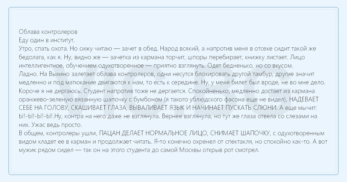 В общем, контролеры ушли, ПАЦАН ДЕЛАЕТ НОРМАЛЬНОЕ ЛИЦО, СНИМАЕТ ШАПОЧКУ, с одухотворенным видом кладет ее в карман и продолжает читать. Я-то конечно охренел от спектакля, но спокойно как-то. А вот мужик рядом сидел — так он на этого студента до самой Москвы открыв рот смотрел.