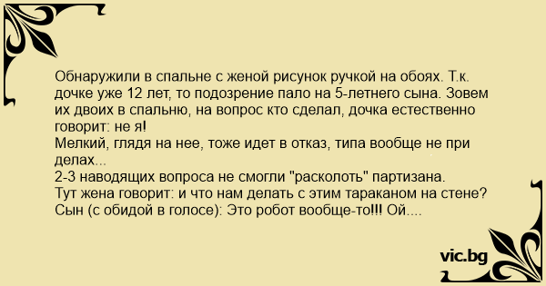 Обнаружили в спальне с женой рисунок ручкой на обоях. Т.к. дочке уже 12 лет, то подозрение пало на 5-летнего сына. Зовем их двоих в спальню, на вопрос кто сделал, дочка естественно говорит: не я! Мелкий, глядя на нее, тоже идет в отказ, типа вообще не при делах... 2-3 наводящих вопроса не смогли "расколоть" партизана. Тут жена говорит: и что нам делать с этим тараканом на стене? Сын (с обидой в голосе): Это робот вообще-то!!! Ой....
