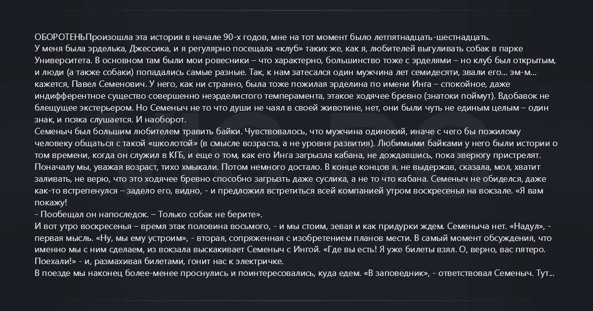 ОБОРОТЕНЬПроизошла эта история в начале 90-х годов, мне на тот момент было летпятнадцать-шестнадцать. У меня была эрделька, Джессика, и я регулярно посещала «клуб» таких же, как я, любителей выгуливать собак в парке Университета. В основном там были мои ровесники – что характерно, большинство тоже с эрделями – но клуб был открытым, и люди (а также собаки) попадались самые разные. Так, к нам затесался один мужчина лет семидесяти, звали его… эм-м… кажется, Павел Семенович. У него, как ни странно, была тоже пожилая эрделина по имени Инга – спокойное, даже индифферентное существо совершенно неэрделистого темперамента, этакое ходячее бревно (знатоки поймут). Вдобавок не блещущее экстерьером. Но Семеныч не то что души не чаял в своей животине, нет, они были чуть не единым целым – один знак, и псяка слушается. И наоборот. Семеныч был большим любителем травить байки. Чувствовалось, что мужчина одинокий, иначе с чего бы пожилому человеку общаться с такой «школотой» (в смысле возраста, а не уровня развития). Любимыми байками у него были истории о том времени, когда он служил в КГБ, и еще о том, как его Инга загрызла кабана, не дождавшись, пока зверюгу пристрелят. Поначалу мы, уважая возраст, тихо хмыкали. Потом немного достало. В конце концов я, не выдержав, сказала, мол, хватит заливать, не верю, что это ходячее бревно способно загрызть даже суслика, а не то что кабана. Семеныч не обиделся, даже как-то встрепенулся – задело его, видно, - и предложил встретиться всей компанией утром воскресенья на вокзале. «Я вам покажу! - Пообещал он напоследок. – Только собак не берите». И вот утро воскресенья – время этак половина восьмого, - и мы стоим, зевая и как придурки ждем. Семеныча нет. «Надул», - первая мысль. «Ну, мы ему устроим», - вторая, сопряженная с изобретением планов мести. В самый момент обсуждения, что именно мы с ним сделаем, из вокзала выскакивает Семеныч с Ингой. «Где вы есть! Я уже билеты взял. О, верно, вас пятеро. Поехали!» - и, размахивая билетами, гонит нас к электричке. В поезде мы наконец более-менее проснулись и поинтересовались, куда едем. «В заповедник», - ответствовал Семеныч. Тут я проснулась совсем. - «Так он же сегодня закрыт!» «Верно мыслишь. Но для нас откроют». - «Ну-ну», - подумала я. Точно. Открыли. Даже не только открыли, но встретили на станции аж на двух машинах. В душу закрались подозрения – а так ли прост Семеныч. Ну ладно, приезжаем в заповедник. Чай, знакомство с лосями, доброе отношение – все признаки, что гостям рады. И вот, наконец, загон, в котором ходит одинокий кабан – не слишком мелкий, надо признать. Семеныч подзывает Ингу (она у него всегда шарилась без поводка, в одном ошейнике, совершенной рухляди, смысл которого был лишь в том, чтобы держать на себе жетончик), снимает ошейник и достает из рюкзачка другой. Мама моя! Это был не просто ошейник, это был Ошейник с большой буквы, скорее походящий на бронежилет для шеи – из толстой кожи, широченный, весь в металлических бляхах. Стоило только этой «амуниции» коснуться шеи Инги, как та начала преображаться, прямо как в фильмах ужасов. Все мышцы натянулись, тело подобралось, глаза загорелись, а движения сделались такими стремительными, что глаз не всегда их улавливал. Команды не прозвучало, был лишь какой-то легкий разрешающий жест. Эрделина сорвалась с места, длинным прыжком перемахнула почти дв