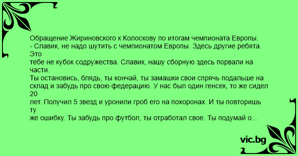 Обращение Жириновского к Колоскову по итогам чемпионата Европы. - Славик, не надо шутить с чемпионатом Европы. Здесь другие ребята. Это тебе не кубок содружества. Славик, нашу сборную здесь порвали на части. Ты остановись, блядь, ты кончай, ты замашки свои спрячь подальше на склад и забудь про свою федерацию. У нас был один генсек, то же сидел 20 лет. Получил 5 звезд и уронили гроб его на похоронах. И ты повторишь ту же ошибку. Ты забудь про футбол, ты отработал свое. Ты подумай о будущем Российского футбольного союза. Он гибнет! Талантливые организаторы бегут из футбола. Твоя федерация - эта барахолка, блядь. Ни идей, нету, блядь, ни проектов. Нету у тебя Галиани, нету Берлускони. Весь мир смотрит Бэкхема, Зидана, блядь. И здесь, в Португалии. Здесь любят президента, а тебя в России презирают, презирают. Твой соотечественник, блядь, Абрамович, блядь, купил команду прямо из премьер-лиги. Это совсем уже охуели, блядь, чтобы какой-то чукча из России создавал команду в Англии, а не России! Это что, РФС, блядь? Вы что делаете, блядь? Какой, нахуй, РФС? Какой чемпионат Европы? Славик! Посмотри на Бышовца. 16 лет назад он выиграл Олимпийские Игры. И с тех пор Бышовец один тебя посылает на хуй. Один! Все остальные, блядь, лебезят перед тобой. Выстроились строем, чтобы тебе поклониться. Шестнадцать лет тебе сопротивляется, а ты со своей хреновой футбольной федерацией ни хуя не можешь сделать. Ты видишь как нас судят в Европе, как нас унижают? Ты что-нибудь сделал? А мы в следующий раз заявим «Терек». Мы знаем этих футболистов из Грозного. Они любую европейскую сборную порвут на части. Они все разнесут. Они все домашние встречи выиграют 10:0. А ты говоришь, у нас нету игроков? Славик, ты никогда не победишь. Это твое последнее поражение. Ты проиграл Португалию. Португалия - твоя могила. Понял, ты, Слава, сраный президент? А на стадионе «Челси» уже говорят по-русски. Мы направим в Англию еще 10 Абрамовичей, купим 10 команд и изберем в Англии своего президента Английской федерации. Ну это потом. А сейчас ты, Славик, уходи в отставку, сделай это по-хорошему и ты получишь должность директора ДЮСШ на Чукотке. Ты понял, Славик? Sever-11