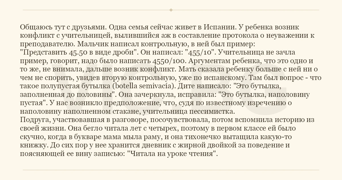 "Представить 45.50 в виде дроби". Он написал: "455/10". Учительница не зачла пример, говорит, надо было написать 4550/100. Аргументам ребенка, что это одно и то же, не внимала, дальше возник конфликт. Мать сказала ребенку больше с ней ни о чем не спорить, увидев вторую контрольную, уже по испанскому. Там был вопрос - что такое полупустая бутылка (botella semivacía). Дите написало: "Это бутылка, заполненная до половины". Она зачеркнула, исправила: "Это бутылка, наполовину пустая". У нас возникло предположение, что, судя по известному изречению о наполовину наполненном стакане, учительница пессимистка.