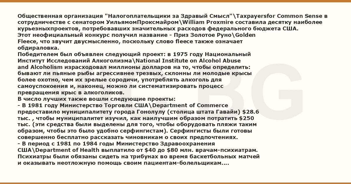 Общественная организация "Налогоплательщики за Здравый Смысл"\Taxpayersfor Common Sense в сотрудничестве с сенатором УильямомПроксмайром\William Proxmire составила десятку наиболее курьезныхпроектов, потребовавших значительных расходов федерального бюджета США.