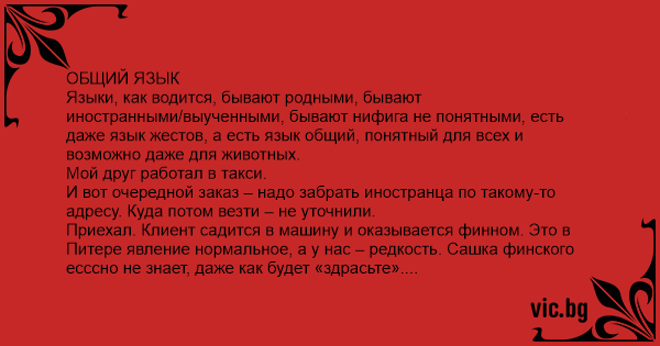 Приехал. Клиент садится в машину и оказывается финном. Это в Питере явление нормальное, а у нас – редкость. Сашка финского есссно не знает, даже как будет «здрасьте». Сносно знает английский и примитивно немецкий. Финн тоже по-русски ни слова, зато знает несколько слов по-французски. Даже выговаривает с прононсом, но от этого никому не легче. Куда его транспортировать по-прежнему непонятно.