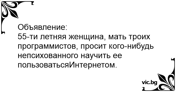 55-ти летняя женщина, мать троих программистов, просит кого-нибудь непсихованного научить ее пользоватьсяИнтернетом.