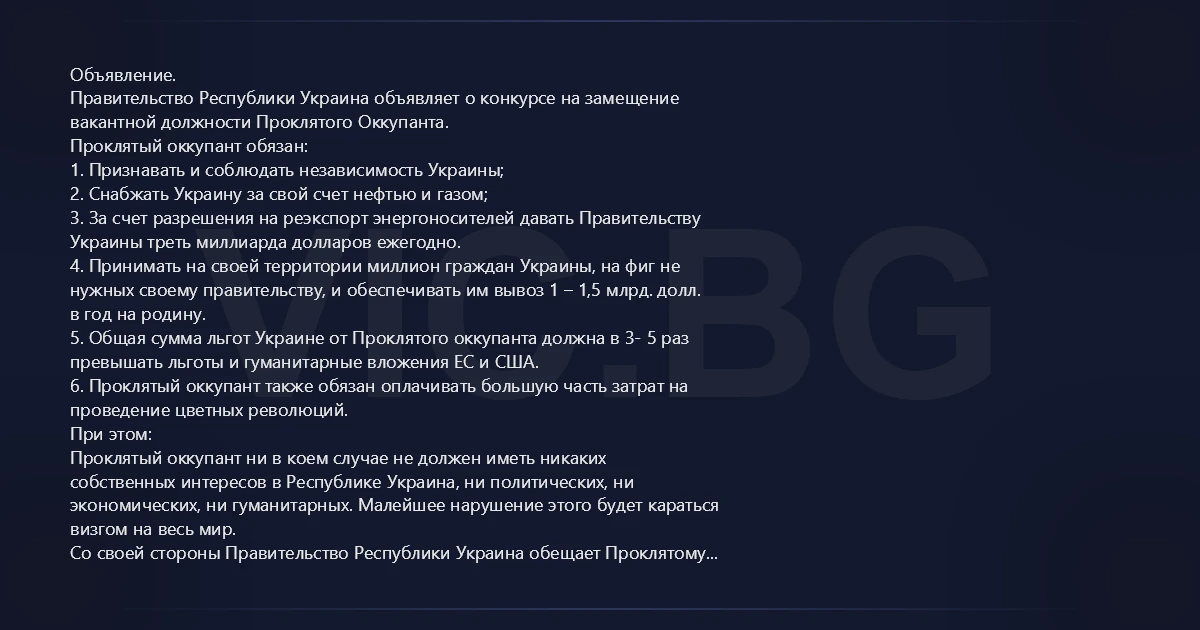 Объявление. Правительство Республики Украина объявляет о конкурсе на замещение вакантной должности Проклятого Оккупанта. Проклятый оккупант обязан: 1. Признавать и соблюдать независимость Украины; 2. Снабжать Украину за свой счет нефтью и газом; 3. За счет разрешения на реэкспорт энергоносителей давать Правительству Украины треть миллиарда долларов ежегодно. 4. Принимать на своей территории миллион граждан Украины, на фиг не нужных своему правительству, и обеспечивать им вывоз 1 – 1,5 млрд. долл. в год на родину. 5. Общая сумма льгот Украине от Проклятого оккупанта должна в 3- 5 раз превышать льготы и гуманитарные вложения ЕС и США. 6. Проклятый оккупант также обязан оплачивать большую часть затрат на проведение цветных революций. При этом: Проклятый оккупант ни в коем случае не должен иметь никаких собственных интересов в Республике Украина, ни политических, ни экономических, ни гуманитарных. Малейшее нарушение этого будет караться визгом на весь мир. Со своей стороны Правительство Республики Украина обещает Проклятому оккупанту: 1. Тырить его собственность в особо крупных размерах, сбивать его самолеты, устраивать территориальные скандалы и пр. 2. Обвинять Проклятого оккупанта во всех внутренних и внешних проблемах Украины. 3. Обвинять его же во всех других проблемах, - так, для профилактики. 4. Вступать во все политические организации, недружественные Проклятому оккупанту. Представители стран, желающих занять вакантный пост Проклятого оккупанта, должны в оранжевых робах выстроиться в очередь в Киеве, на Майдане Незалежности. Взятки должностным лицам при проведении конкурса приветствуются. Девиз конкурса – «Есче глупость не згинела».