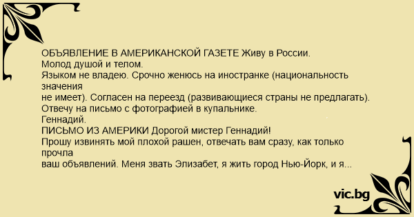 ОБЪЯВЛЕНИЕ В АМЕРИКАНСКОЙ ГАЗЕТЕ Живу в России. Молод душой и телом. Языком не владею. Срочно женюсь на иностранке (национальность значения не имеет). Согласен на переезд (развивающиеся страны не предлагать). Отвечу на письмо с фотографией в купальнике. Геннадий. ПИСЬМО ИЗ АМЕРИКИ Дорогой мистер Геннадий! Прошу извинять мой плохой рашен, отвечать вам сразу, как только прочла ваш объявлений. Меня звать Элизабет, я жить город Нью-Йорк, и я согласна вас переехать, несмотря на то, что вы вообще не владеть языком. Обещаю выучить сурдоперевод, чтобы вас понимай. Дарю вам мой фотографий, завернутый в купальник, хотя толком не уразумевай, зачем вам мой купальник необходим. Хочу вас спрашивать: почему вы решил взять в свой супруг американка. Неужели у вас большой дефицит русский женщина? Пишите и посылайте меня на адрес на конверт. Элизабет. ПИСЬМО В АМЕРИКУ Глубокоуважаемая мисс Элизабет! С приветом к вам ваш изнывающий от одиночества друг из далекой России. Спешу сообщить, что вы меня неверно поняли: во-первых, я вовсе не немой (с чего вы взяли?), а во-вторых, я просил просто фото, без купальника, а купальник мне не нужен, я его сразу загнал на толчке. Шлю вам и свой портрет, правда не новый. Это друзья сняли меня в армии, когда я стоял на часах. А жениться на иностранке я хочу вовсе не потому, что у нас дефицит женщин, а из протеста. Ваши американские мистеры и сэры сплошь и рядом женятся на русских бабах, но я перерыл все газеты и не нашел ни одного брачного объявления, где иностранке требовался бы русский мужчина. Вопиющее безобразие, я считаю, чем мы, мужики, хуже?! Поэтому я буду рад, если вы пришлете мне приглашение и денег на билет. С нетерпением жду ответа. Геннадий. ПИСЬМО ИЗ АМЕРИКИ Дорогой Геннадий! Со слезами в глазах прочитала я ваш письмо, ничего не поняла и отправилась в кафе на Брайтон-Бич, чтобы ваш соотечественники разъяснять мне некоторые выражения. Там мне сказали, что "с приветом" – это есть тяжелая форма шизофрения, а "толчок" – есть русский унитаз. Мой бедная Геннадий, как мне вас жаль! И, конечно, жаль мой новый купальник, которую вы так бестолково распорядили. Тем не менее, все еще согласна вас переехать, если только ваш тяжкий недуг не наследственное и не от употреблений наркотик. Полагаю, ваш умственный повреждений произошел именно в Российский Армия, где вас заставляли вставать на собственный часы и постоянно снимали (на Брайтон-Бич мне объяснять, что значит "снимать"). Это ужасно, сочувствую вам от всех сердец. Дарю, как просил, фото, где я без купальника. Присылайте меня на адрес. Элизабет. ПИСЬМО В АМЕРИКУ Уважаемая Элизабет! Не ходите больше на Брайтон-Бич и не спрашивайте у наших эмигрантов значение непонятных слов. Мои бывшие соотечественники над вами просто издеваются. Объясняю в первый и последний раз: никакой шизофрении у меня нет, ваш купальник я продал, а в армии никто не заставлял меня топтать часы и не "снимал" в том пошлом смысле, на который вы намекаете. А за фото спасибо, его я тоже загнал, простите, продал. Вы, может быть, не поверите, но за пять тысяч (что примерно равнозначно вашему баксу) у меня его с руками оторвали. Жду ответа и денег. Геннадий. ПИСЬМО ИЗ АМЕРИКИ Мой милый Геннадий! Я был в шок, когда узнала про твой оторванный руки. Как же ты писать – неужели нога?! Буду срочно тебя переехать при первая возможность, чтобы ухаж