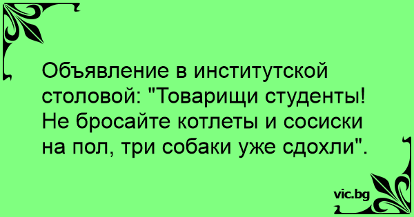 Объявление в институтской столовой: "Товарищи студенты! Не бросайте котлеты и сосиски на пол, три собаки уже сдохли".