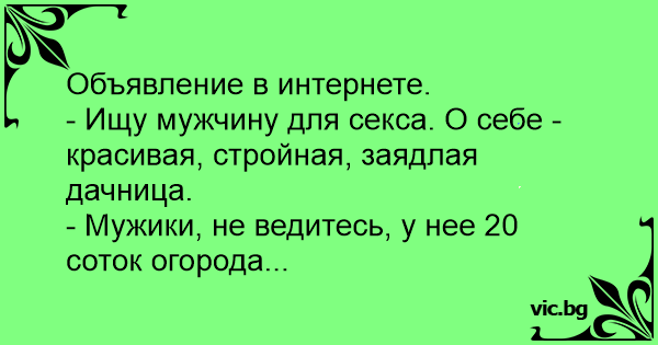 - Ищу мужчину для cekca. О себе - красивая, стройная, заядлая дачница.