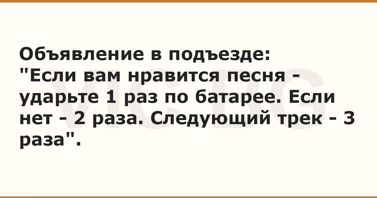 Объявление в подъезде: "Если вам нравится песня - ударьте 1 раз по батарее. Если нет - 2 раза. Следующий трек - 3 раза".