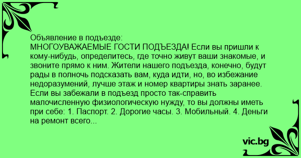МНОГОУВАЖАЕМЫЕ ГОСТИ ПОДЪЕЗДА! Если вы пришли к кому-нибудь, определитесь, где точно живут ваши знакомые, и звоните прямо к ним. Жители нашего подъезда, конечно, будут рады в полночь подсказать вам, куда идти, но, во избежание недоразумений, лучше этаж и номер квартиры знать заранее. Если вы забежали в подъезд просто так-справить малочисленную физиологическую нужду, то вы должны иметь при себе: 1. Паспорт. 2. Дорогие часы. 3. Мобильный. 4. Деньги на ремонт всего подъезда. 5. Пару костылей. 6. Йод. 7. Вату. 8. Бинт. 9. Полмешка гипса. 10. Завещание. Уважаемые жильцы и гости подъезда, ПОМНИТЕ-лучше быть здоровым человеком без лампочки, чем инвалидом второй группы с лампочкой. Тем более, что если вас поймают при краже лампочки, не исключено, что вы будете поражены в то место вашего организма, которое можно использовать как патрон. ДОБРО ПОЖАЛОВАТЬ К НАМ В ПОДЪЕЗД!