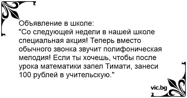 "Со следующей недели в нашей школе специальная акция! Теперь вместо обычного звонка звучит полифоническая мелодия! Если ты хочешь, чтобы после урока математики запел Тимати, занеси 100 рублей в учительскую."