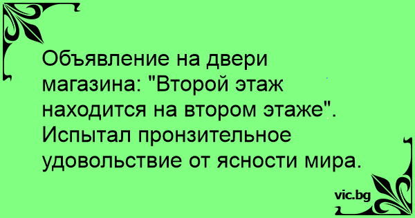 Объявление на двери магазина: "Второй этаж находится на втором этаже".