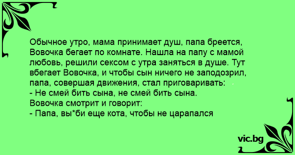 Обычное утро, мама принимает душ, папа бреется, Вовочка бегает по комнате. Нашла на папу с мамой любовь, решили сексом с утра заняться в душе. Тут вбегает Вовочка, и чтобы сын ничего не заподозрил, папа, совершая движения, стал приговаривать:
