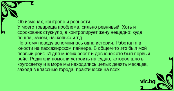 Об изменах, контроле и ревности. У моего товарища проблема: сильно ревнивый. Хоть и сороковник стукнуло, а контролирует жену нещадно: куда пошла, зачем, насколько и т.д. По этому поводу вспомнилась одна история. Работал я в юности на пассажирском лайнере. В общем-то это был мой первый рейс. И для многих ребят и девчонок это был первый рейс. Родители помогли устроить на судно, которое шло в кругосветку и в море мы находились целых девять месяцев, заходя в классные города, практически на всех континентах. Но дело в общем-то не в этом. Работала с нами в рейсе молодая пара. Назовем их Маша и Дима (имена изменил). Ребята примерно нашего возраста: лет 18/19-ти. И как говорят, они с первого класса вместе, любовь до гроба, все дела. Они даже учиться вместе пошли, а потом отец девушки устроил их на первый рейс. Дима работал в баре, а Маша бортпроводницей. В общем-то семейные пары на нашем судне были не в диковинку. Но Маша и Дима как раз женаты не были, но все равно все восхищались как он на нее смотрит, как она, как он ухаживал за ней. А экипаж-то совместный: половина одесситов, половина австралийцев. И вот, по прошествии 9-ти месяцев, наш экипаж сменяется на новый: мы должны сходить на берег и лететь в Одессу, а ребята-австралийцы остаются в Сиднее. Когда одесситы уже садились в автобусы чтобы ехать в аэропорт, случился пиздeц. Подбегает Маша к Диме и на глазах у всех говорит: "Прости, Дима, но я остаюсь с Майклом здесь в Сиднее. Я его полюбила". Сказать, что у всех вокруг отпала челюсть, это ничего не сказать. Как? Когда? Где? Майкл был австралийцем, работал фотографом и еще подрабатывал музыкантом в команде. Мужику за 30, но был веселый и прикольный. И ни у кого даже в мыслях не возникало, что мог быть какой-то роман между Майклом и Машей. Мы праздновали Новый Год на Бали, сидели у костра все вместе: Дима с Машей, Майкл играл на гитаре, мы слушали и никто даже не заметил, как у них (как потом выяснилось) закрутился роман. Да такой роман, что даже близкие подруги не узнали. Маша встречалась с ним во время работы, забегая в каюту. Как ей удавалось полгода быть никем не замеченной, остается супер тайной. Конечно, для Димки это был шок, пиздeц и конец света. Пробухал всю дорогу до дома. Но это и понятно, никто не осудил. Многие по приезду домой ощутили нечто подобное. Так всё это к чему!? Бессмысленно контролировать человека. Если та Маша умудрилась скрывать роман ото всех, на судне, посреди океана, со ста сорока человек экипажа, так неужели девушка, если она вздумает завести отношения на стороне, не найдет способ в миллионном городе? Наивный ты мой друг. Контроль бесполезен. Они хитрее нас)